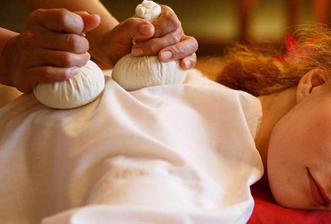 Warm herbal compress therapy designed to soothe sore muscles and boost circulation.